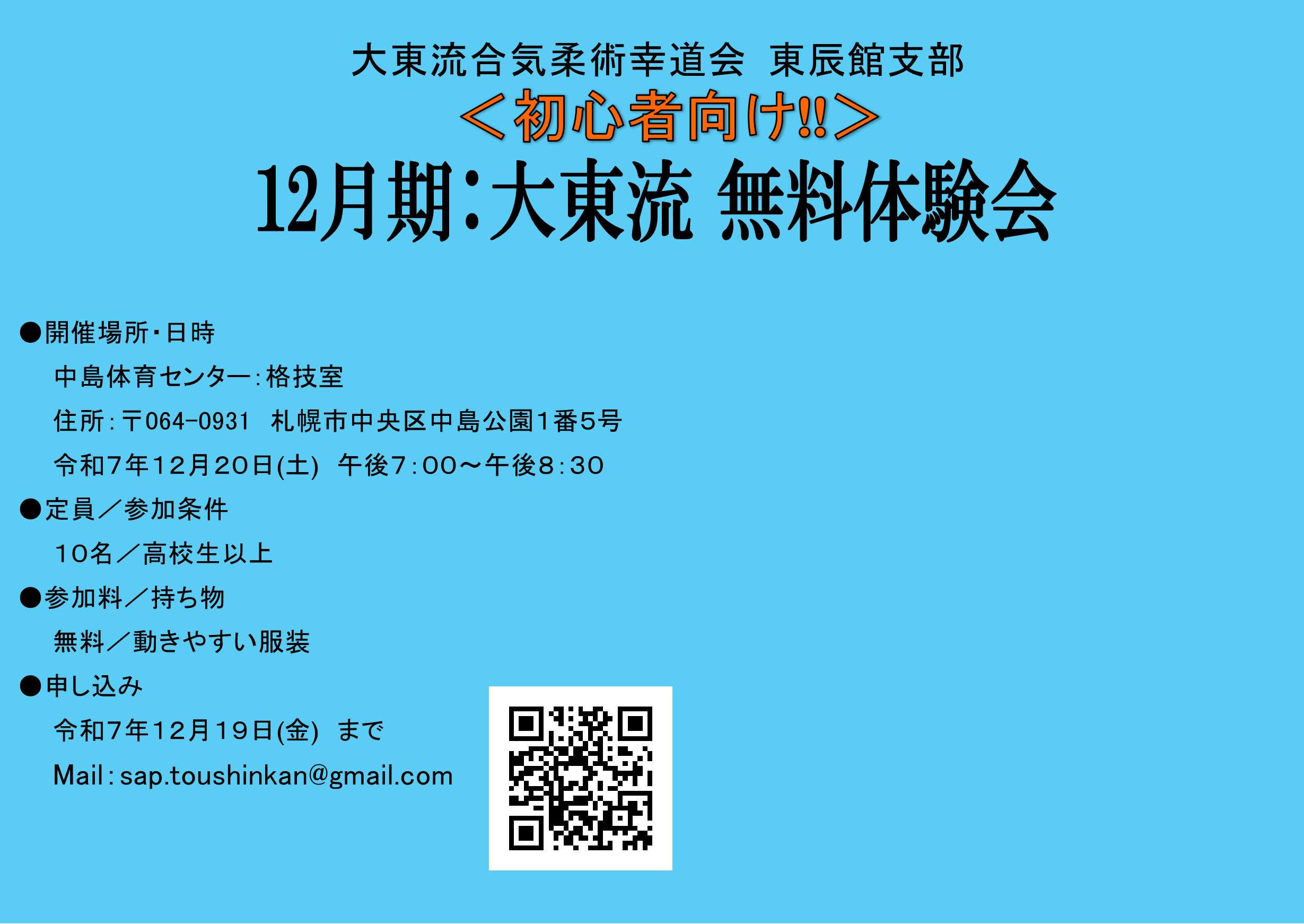 ・R7.11.28 令和7年12月期の大東流体験会(初心者向け)を12月20日(土)に行います。